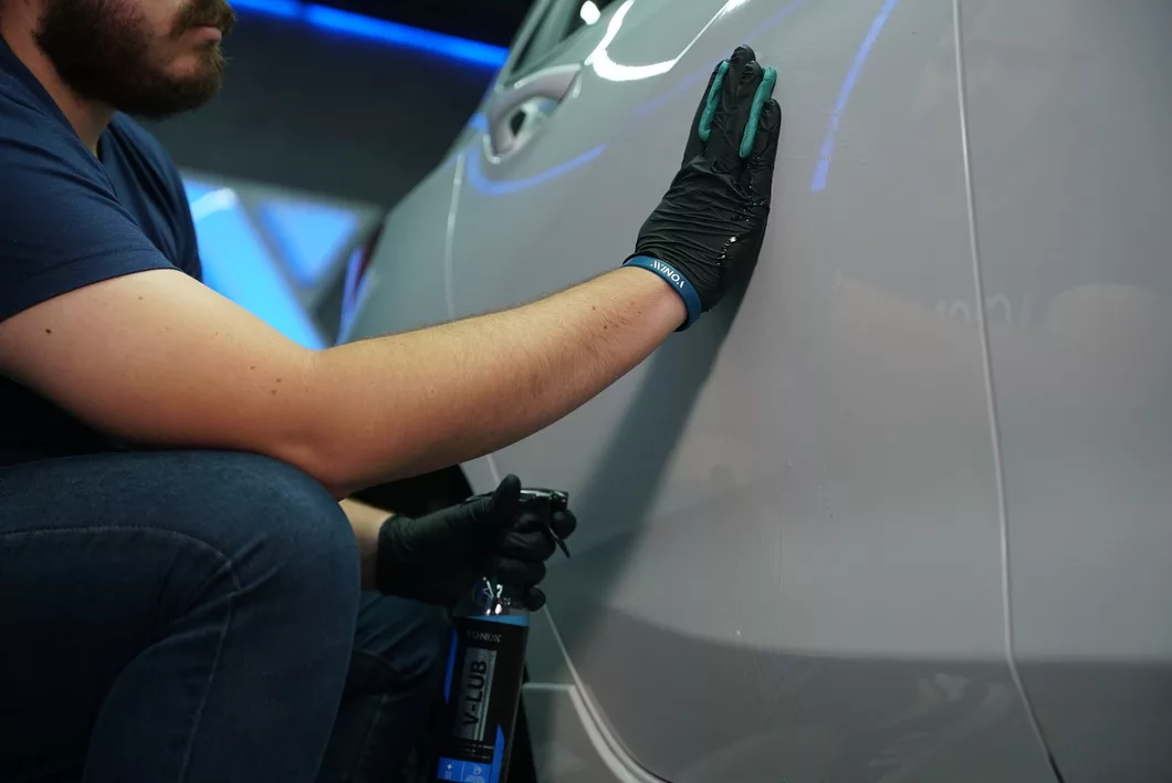 Gently glide the clay or decontamination tool over the surface — allowing V-Lub to provide smooth, low-friction movement.